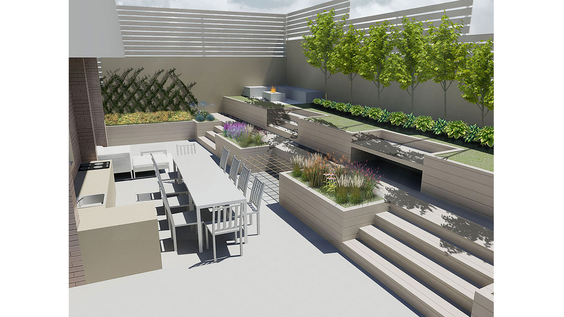Questo spazio esterno nel cuore della caotica città, avvolge i proprietari in uno spazio intimo e raccolto, organizzato su tre livelli, tramite a dei sapienti terrazzamenti nel verde.