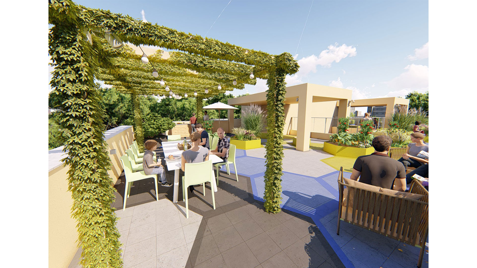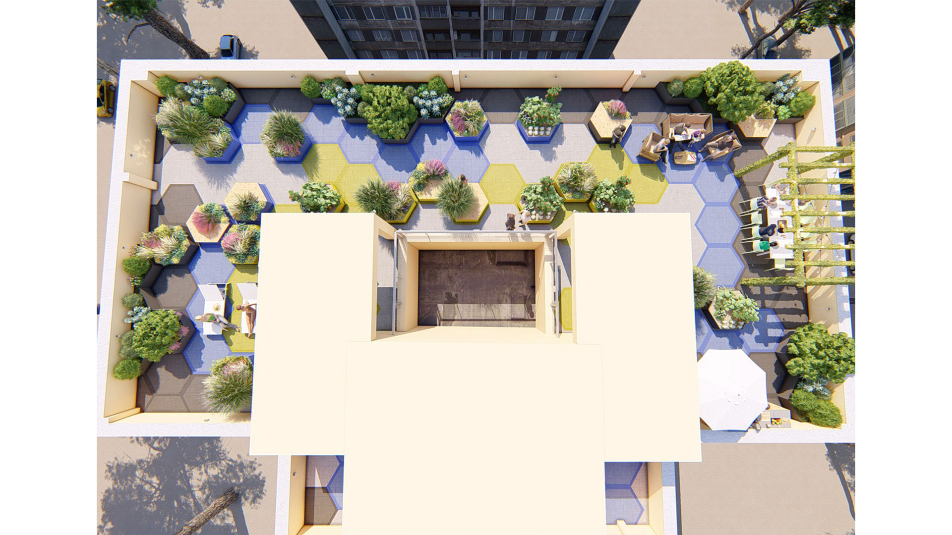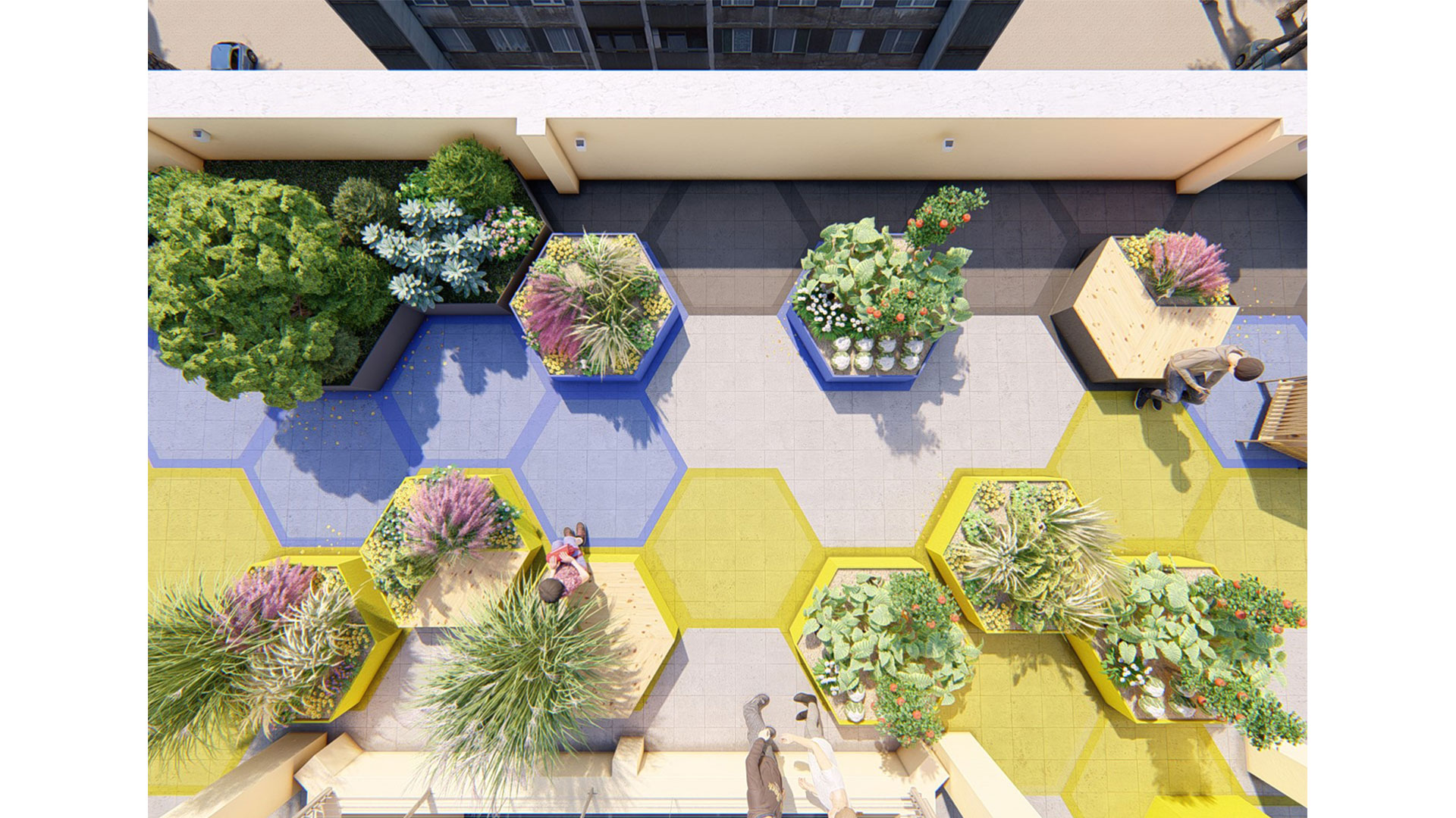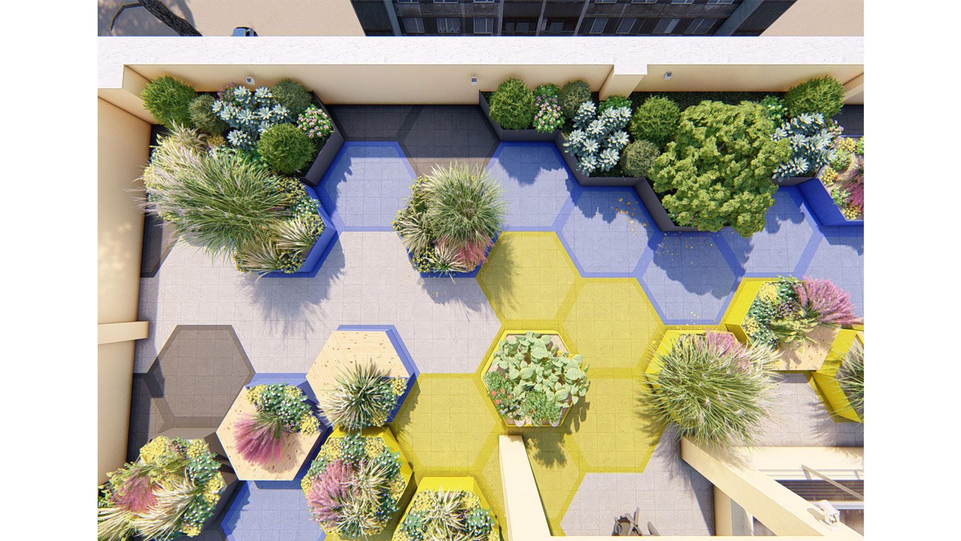 Condivisione e benessere verde sono finalmente possibili grazie allo sviluppo di Alveari, un fantastico Progetto d’esterno che punta alla riqualificazione delle Terrazze condominiali delle nostre città del futuro. Alveari è un progetto che mira al futuro verde delle nostre città dove la condivisione e il benessere dei suoi cittadini sono tra i primi obiettivi pianificati. Il progetto mira alla riqualificazione di spazi esterni completamente abbandonati e in disuso quali le Terrazze condominiali, attraverso la creazione di esagoni modulari che si trasformano una volta in fioriera, una volta in seduta, una volta in aiuola ad orto, in panche contenitori e via via dicendo. Gli esagoni a terra di tre colorazioni diverse scandiscono lo spazio esterno e le sue funzioni: Nelle aree grigie limitrofe ai limiti della Terrazza la percorrenza dei più piccoli deve essere per lo più ristretta, nelle aree celesti si può camminare con un po’ di attenzione, mentre nelle aree gialle i bimbi possono correre e schizzare senza nessun alcun problema; donando loro per esempio un bellissimo playground all’aperto compreso di aree di sosta per i genitori. Per finire un bellissimo pergolato con vista sulla città contiene una fantastica area pranzo immersa nel verde. In ultimo tra le altre funzioni di Alveari vi sono: una bellissima cucina all’aperto per cimentarsi ai fornelli tra amici, un’area living con salottino all’aperto, una zona solarium per rilassarsi a un passo da casa, un fantastico orto in terrazza per produrre frutta e verdura a kilometro zero, e fantastiche aiuole di piante ornamentali perenni e mediterranee.
